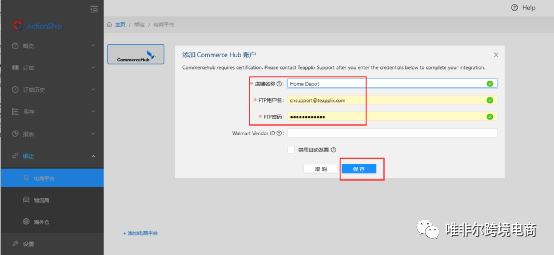 6)、进入Teapplix系统,在菜单【Integrations】-【Marketplaces&Cars】(中文菜单【绑定】-【电商平台】)功能里,点“添加电商平台”按钮,然后选择Commerce Hub平台。再选择“添加 Commerce Hub账户“,填写正式的SFTP对接账号、密码,保存后就完成了Home Depot对接。