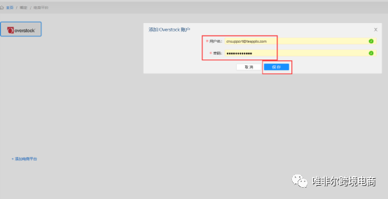 2)、点击“添加Overstock”账户,输入 Overstock 用户名和密码,单击保存。