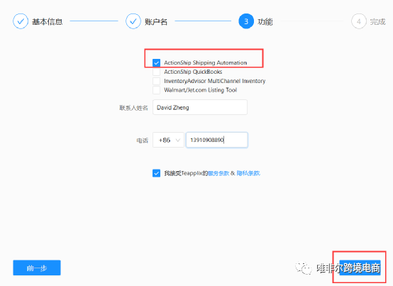 “ActionShip Shipping Automation”功能。然后填写联系人信息,勾选“我接受Teapplix的服务条款&隐私条款”,最后点“开始试用”按钮,即可完成账户注册。