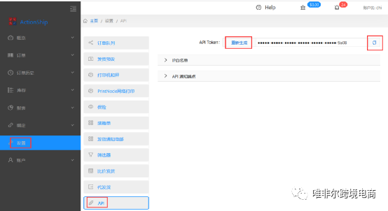 打开菜单“设置”-“API”,复制API Token,并设置到易仓ERP中,就可以使用API来访问对应账户的订单数据。
