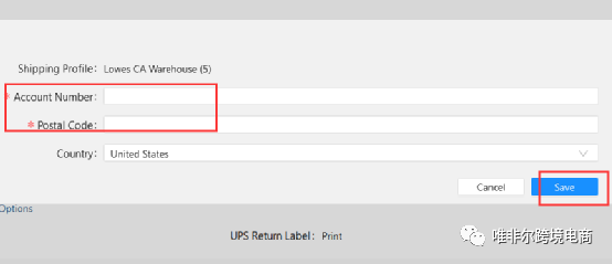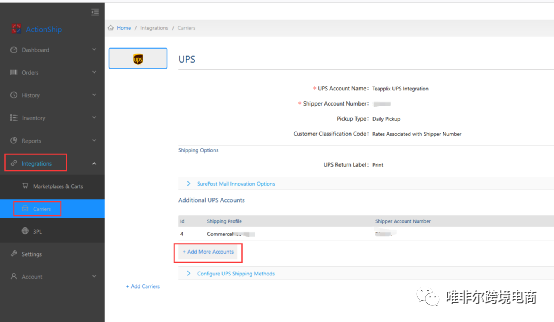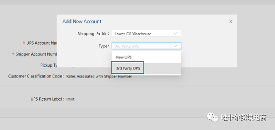 在“Additional UPS/FedEx Account“功能区里,点”Add More accounts”,在弹出窗口里选择一个发货预设(Shipping Profile),Type选择 3rd party UPS/3rd party FedEx”。填写平台提供的物流账号和邮编,然后保存。