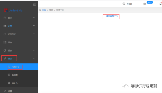 1)、进入Teapplix系统,在菜单【Integrations】-【Marketplaces&Cars】(中文菜单【绑定】-【电商平台】)功能里,点“添加电商平台”按钮,然后选择overstock平台。